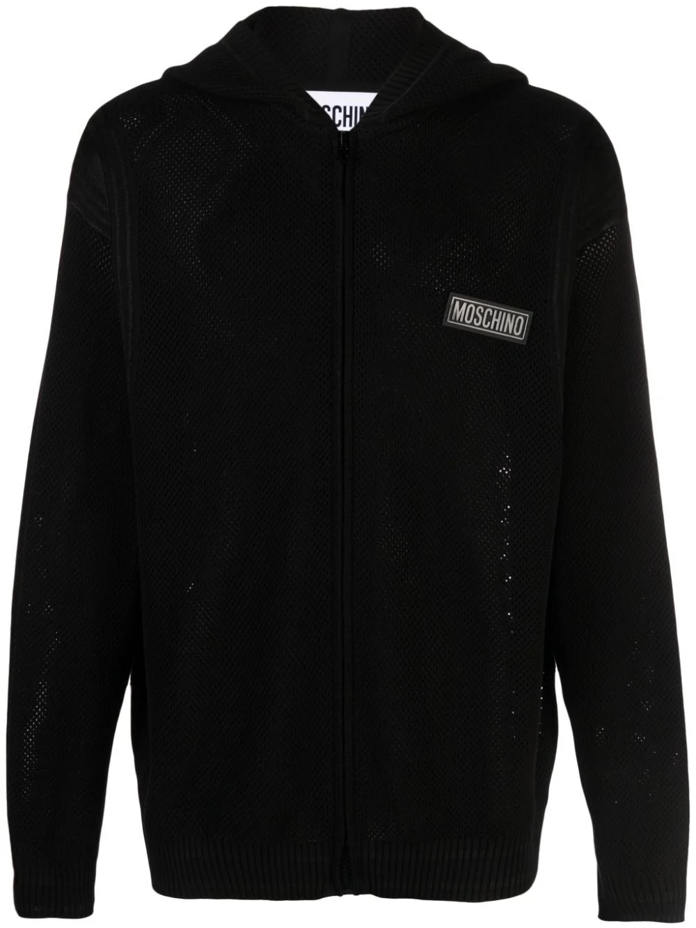 logo-patch open-knit hoodie Highlights - Black - Cotton - Open knit - Rubberised logo detail - Logo patch at the chest - Classic hood - Front zip fastening - Long sleeves - Ribbed cuffs and hem - Straight hem Made in Italy Composition Cotton 100%, Acetate 100% SIZE & FIT Model measurements Height 6 ft 2 in(1.87 m) Bust/Chest 33.46 in(85 cm) Hips 36.22 in(92 cm) Waist 29.52 in(75 cm) FittingInformation Designed for a relaxed fit, this piece allows for comfort and movement when worn Made from a midweight non-stretch fabric, this piece offers minimal elasticity when worn This piece fits true to size – take your usual size Washing instructions Hand Wash