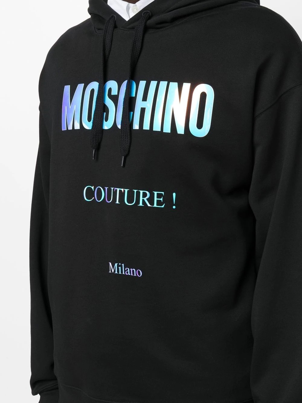 logo-print cotton hoodie logo-print cotton hoodie from MOSCHINO featuring black, organic cotton, jersey fleece, logo print to the front, drawstring hood, long sleeves, fitted-cuff sleeves and straight hem. POSITIVELY CONSCIOUS: This Planet Conscious product is made from at least 50% organic materials, which helps you support organic farming practices such as the restricted use of synthetic chemicals and genetically modified seeds, improved soil fertility and better livestock management.. Imported Composition Organic Cotton 100% SIZE & FIT Model measurements Height 6 ft 0 in(1.84 m) Bust/Chest 36.2 in(92 cm) Hips 38.6 in(98 cm) Waist 29.1 in(74 cm)