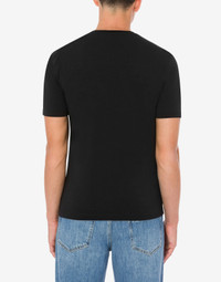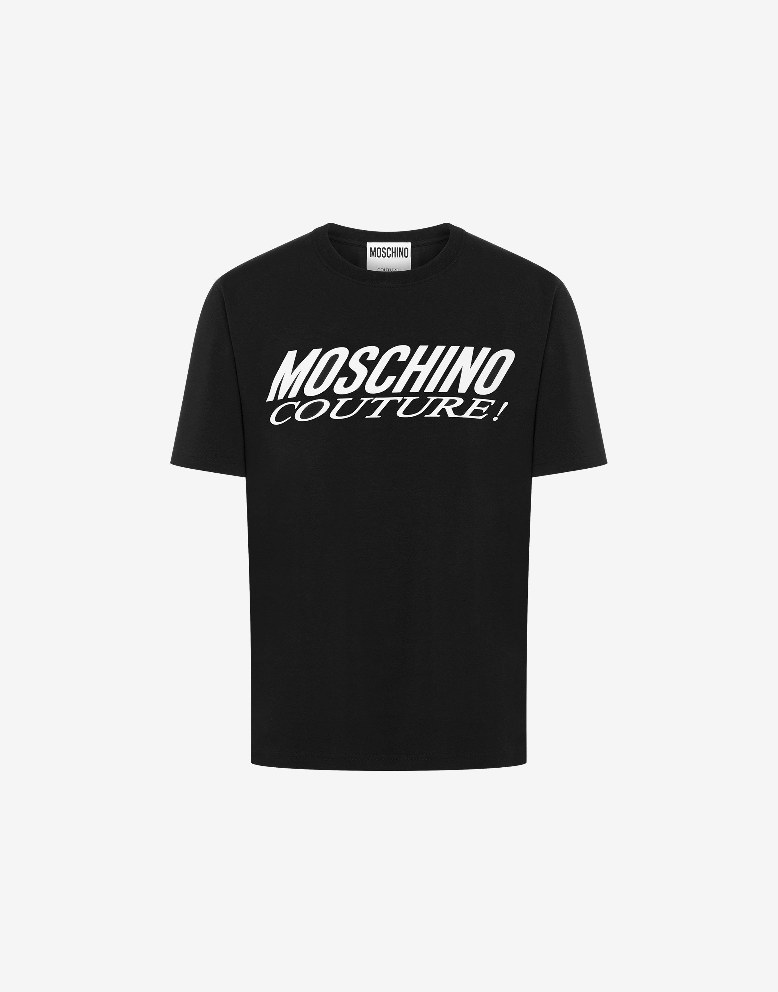 STRETCH COTTON JERSEY T-SHIRT WITH MOSCHINO COUTURE! LOGO PRINT ON THE FRONT. SLIM FIT SHINY PRINTING SHORT SLEEVES FABRIC: 97% COTTON, 3% ELASTAN CODE: AEF242ZR071470391555 FIT MODEL BUST SIZE: 103 CM MODEL HEIGHT: 185 CM MODEL HIPS: 104 CM MODEL SIZE: 48 CM MODEL WAIST: 84 CM