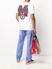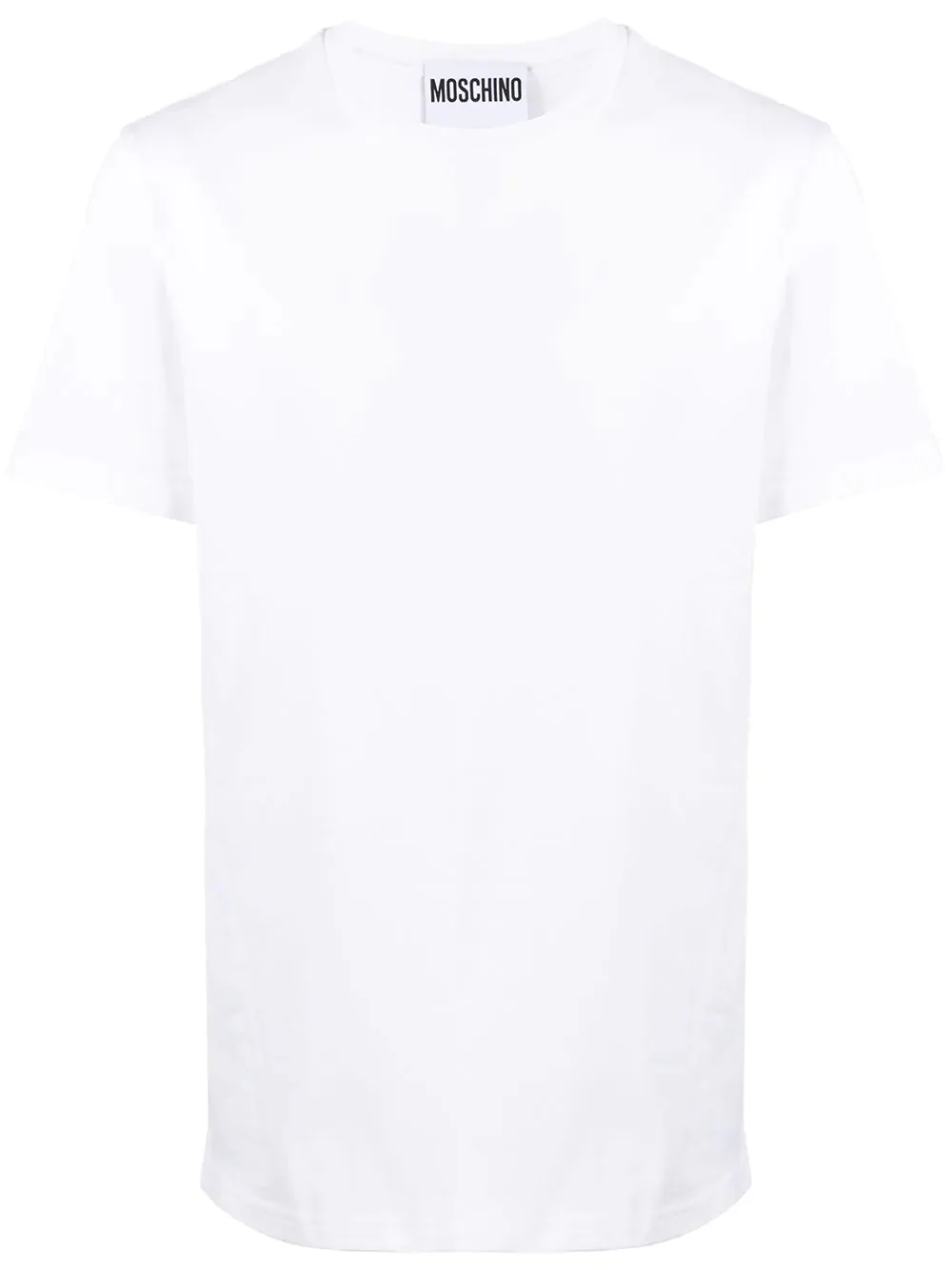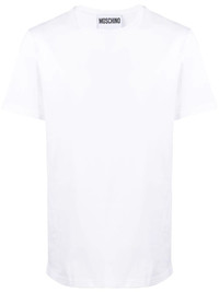 logo T-shirt When you're wearing Moschino, you'll want everyone to know. Made from cotton, this white T-shirt has a round neck, short sleeves and a printed logo at the back. Made in Italy Composition Cotton 100% SIZE & FIT Model measurements Height 6 ft 1 in(1.85 m) Bust/Chest 37.79 in(96 cm) Hips 37.4 in(95 cm) Waist 30.7 in(78 cm) FittingInformation This piece fits true to size. We recommend you get your regular size Cut for a relaxed fit Made with a mid-weight fabric Washing instructions Dry Clean Only