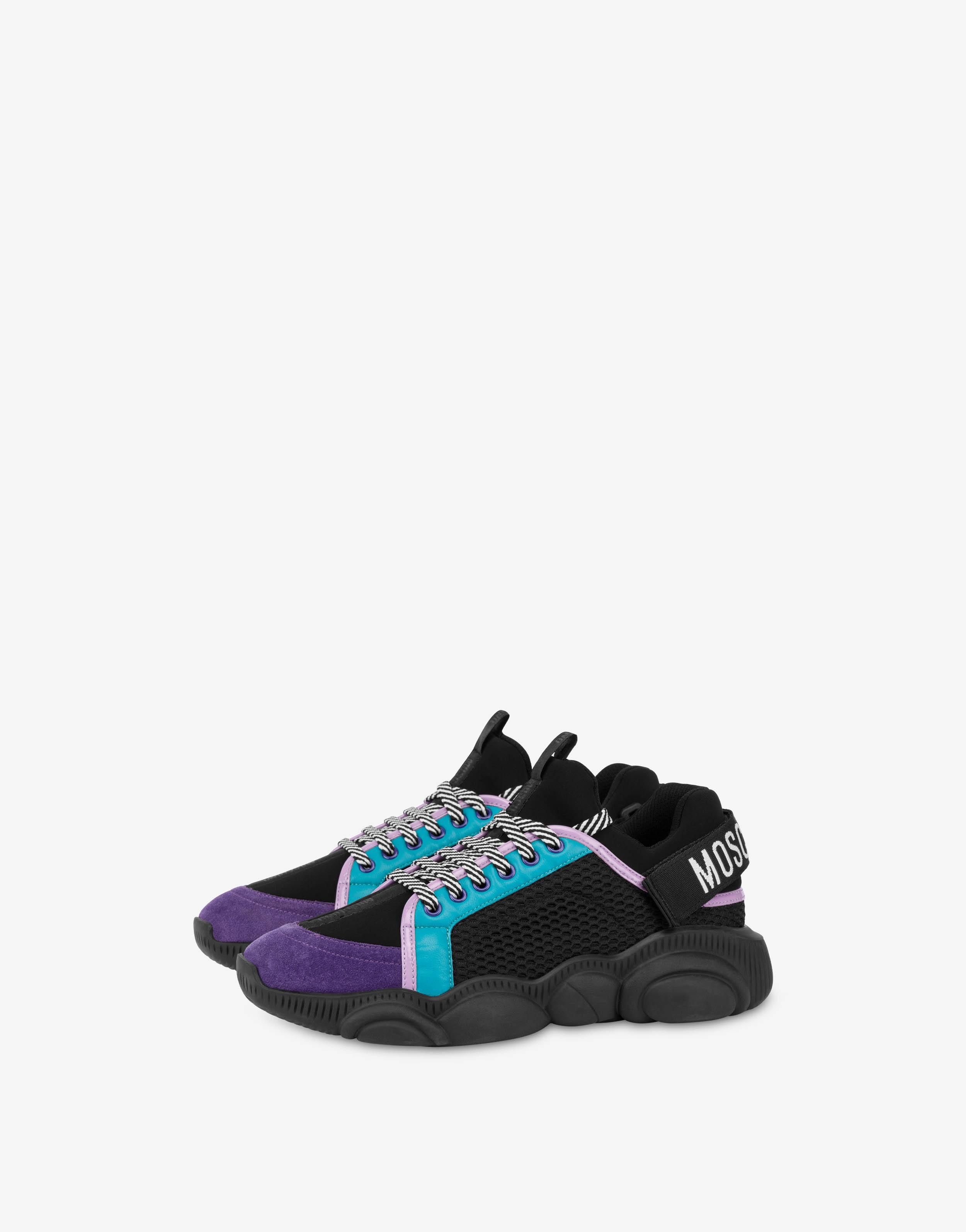 Mixed-material running sneakers with a branded strap on the back and a rubber Moschino Teddy Bear-shaped sole. - Mesh and calfskin upper - Suede detail - Branded strap on the back - Two-tone lace-up fastening - Branded loop on the front - Rubber Teddy sole Bottom:100% Rubber Lining:50% Calfskin, 1% Elastan, 30% Polyamide, 19% Polyester Upper:90% Calfskin, 1% Elastan, 4% Polyamide, 5% Polyester Code: POLMB15133G0FGJ800A FIT - Heel Height : 3.5 cm