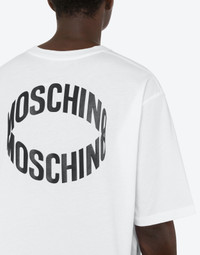 Organic cotton jersey T-shirt with Moschino Loop logo print. - Regular fit - Small print on the front - Large print on the back - Short sleeves - Dropped shoulders Fabric:100% Cotton Code: AEF241ZR072620411001 FIT - Regular fit - Model bust size : 103 - Model height : 185 cm - Model Hips : 104 cm - Model size : 48 - Model waist : 84 cm
