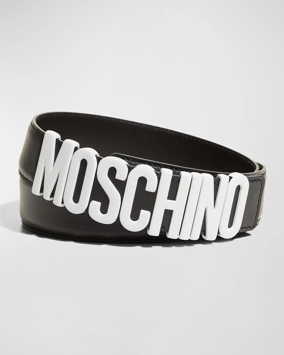 - Moschino belt with contrast logo lettering buckle - Approx. 1.4"W - Adjustable fit - Calf leather - Made in Italy