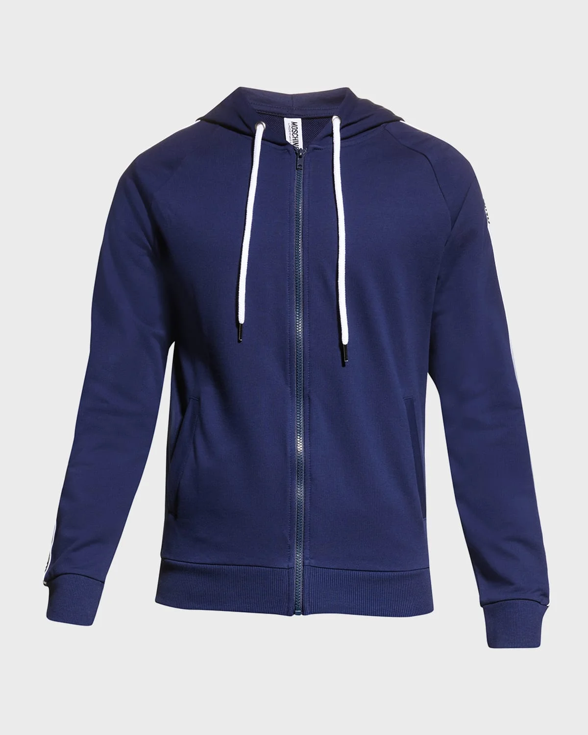 - Men's solid hoodie by Moschino - Drawstring hood; zip front closure - Long raglan sleeves with logo taping - Side slip pockets - Ribbed cuffs and hem - Cotton/elastane - Made in Italy - Model is 6'1"/185cm.