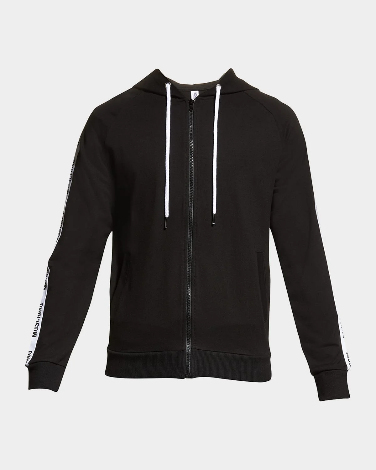 - Men's solid hoodie by Moschino - Drawstring hood; zip front closure - Long raglan sleeves with logo taping - Side slip pockets - Ribbed cuffs and hem - Cotton/elastane - Made in Italy - Model is 6'1"/185cm.