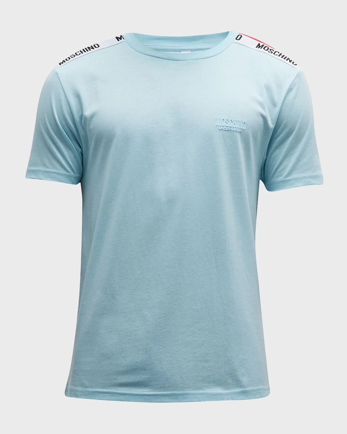 - Moschino T-shirt with logo taping at shoulders - Crew neckline - Embossed logo at chest - Short sleeves - Pullover style - Cotton - Machine wash cold - Made in Greece - Model is 6'1"/185cm.