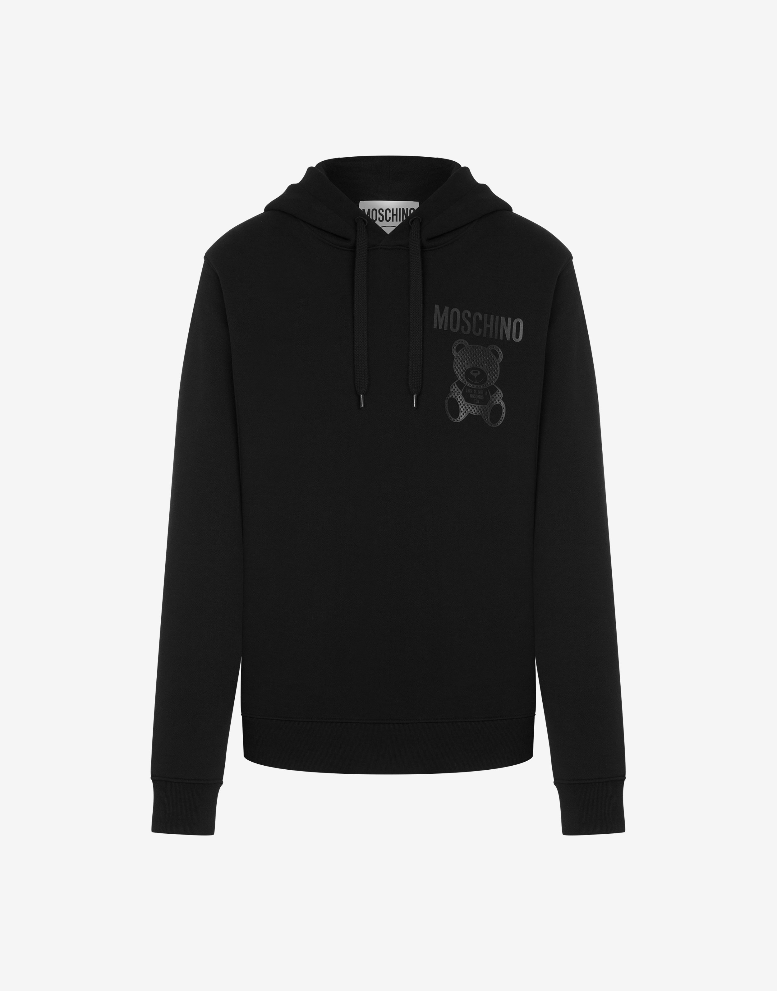 Organic cotton hoodie with mesh-effect Moschino Teddy Bear. - Slim fit - Small logo and Moschino Teddy Bear print on the front - Drawstring hood - Dropped shoulders Fabric:100% Cotton Code: AEF241ZR172720281555 FIT - Slim fit - Model bust size : 103 - Model height : 185 cm - Model Hips : 104 cm - Model size : 48 - Model waist : 84 cm