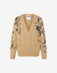 Extrafine merino wool cardigan with hand-painted effect print. - Loose fit - V-neck - Two front pockets - Dropped shoulders - Logo patch on the back - Front button fastening Fabric:100% Pure wool Code: AEF241ZR091920003148 FIT - Loose fit - Model bust size : 103 - Model height : 185 cm - Model Hips : 104 cm - Model size : 48 - Model waist : 84 cm