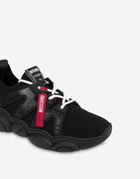 RUNNING SNEAKERS IN A MIX OF DIFFERENT MATERIALS WITH A RED LOGO DETAIL AND A RUBBER SOLE IN THE SHAPE OF MOSCHINO TEDDY BEAR. LACE-UP CLOSURE BRANDED LABEL ON THE TONGUE TEDDY SOLE IN RUBBER BOTTOM: 100% RUBBER LINING: 100% CALFSKIN UPPER: 20% COTTON, 10% ELASTAN, 70% POLYESTER CODE: POLMB15303G1LGL100A FIT HEEL HEIGHT: 3.5 CM