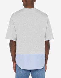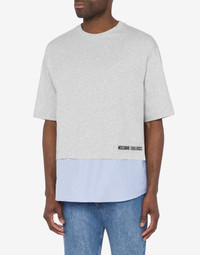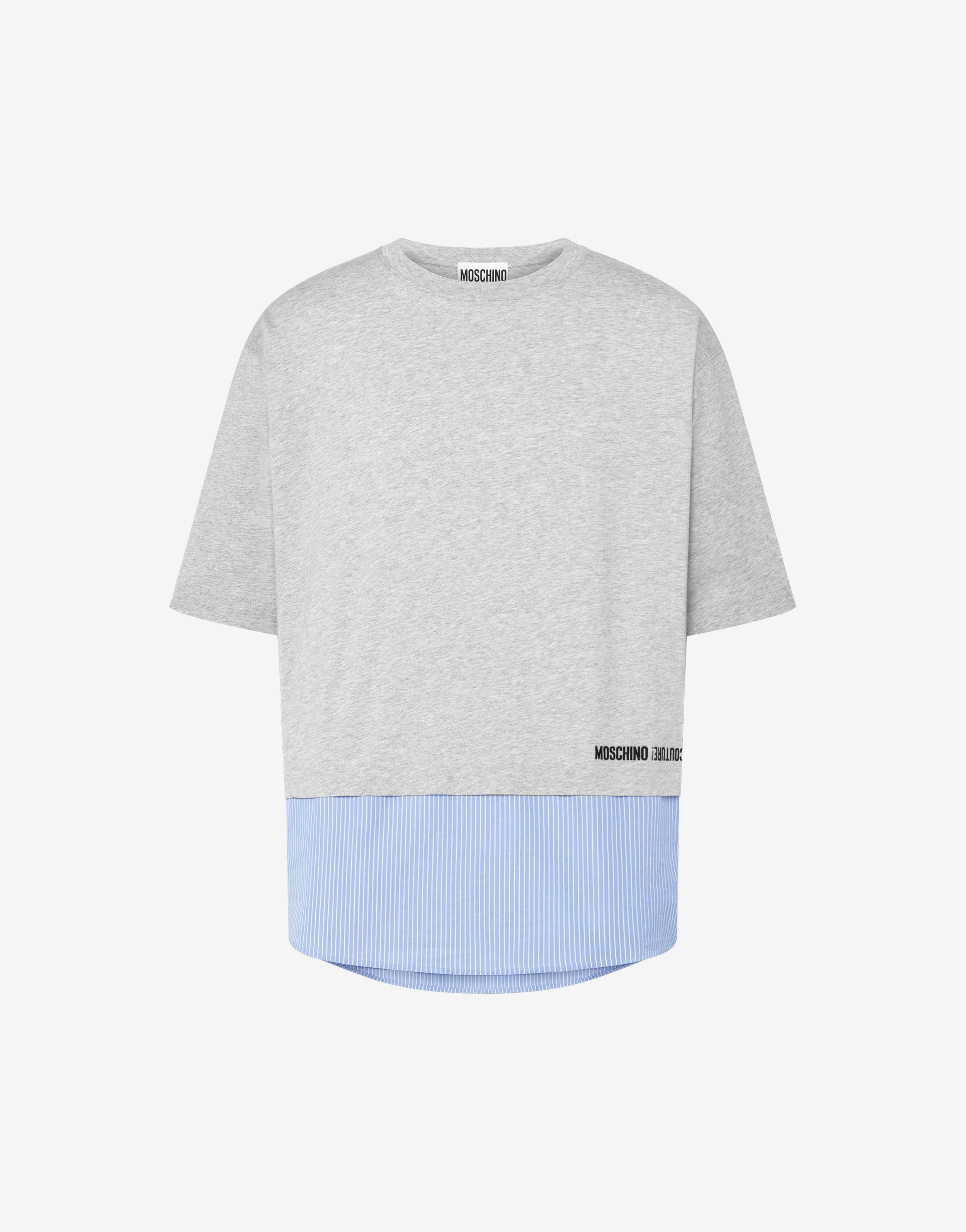 ORGANIC COTTON JERSEY T-SHIRT WITH STRIPED COTTON POPLIN HEM AND MOSCHINO COUTURE! LOGO EMBROIDERY. UPSIDE DOWN DETAIL ON THE FRONT. UPSIDE DOWN LOGO EMBROIDERY SHORT SLEEVES DROPPED SHOULDERS FABRIC: 100% COTTON CODE: AEF242ZR070670415485