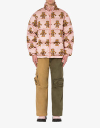 Viscose and wool down jacket with all-over Moschino Teddy Bear robot print. - Regular fit - High collar with zip and internal hood - Front zip closure - Two side pockets with automatic button - Zip closure on the front - Lined - Inner pocket with button Fabric:76% Viscose, 24% Wool Code: AEF222ZR060470501187 FIT - Regular fit - Model bust size : 90 - Model height : 186 Cm - Model Hips : 93 Cm - Model size : 50 - Model waist : 74 Cm