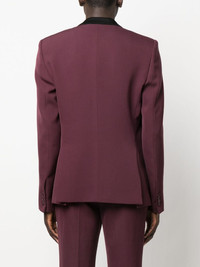single-breasted blazer Highlights - Plum purple - Virgin wool - Contrasting collar - Peak lapels - Front button fastening - Long sleeves - Two front flap pockets Made in Italy Composition Lining: Viscose 100% Outer: Virgin Wool 100%, Polyester 100% SIZE & FIT Model measurements Height 6 ft 2 in(1.87 m) Bust/Chest 36.41 in(92.5 cm) Hips 37 in(94 cm) Waist 29.52 in(75 cm) FittingInformation Designed for a slim fit, offering a comfortable fit that sits just away from the body The vented hem offers movement at the rear Made from a lightweight non-stretch fabric This piece fits true to size – take your usual size