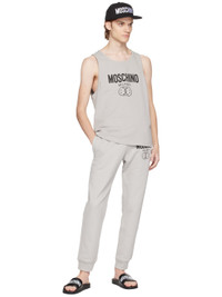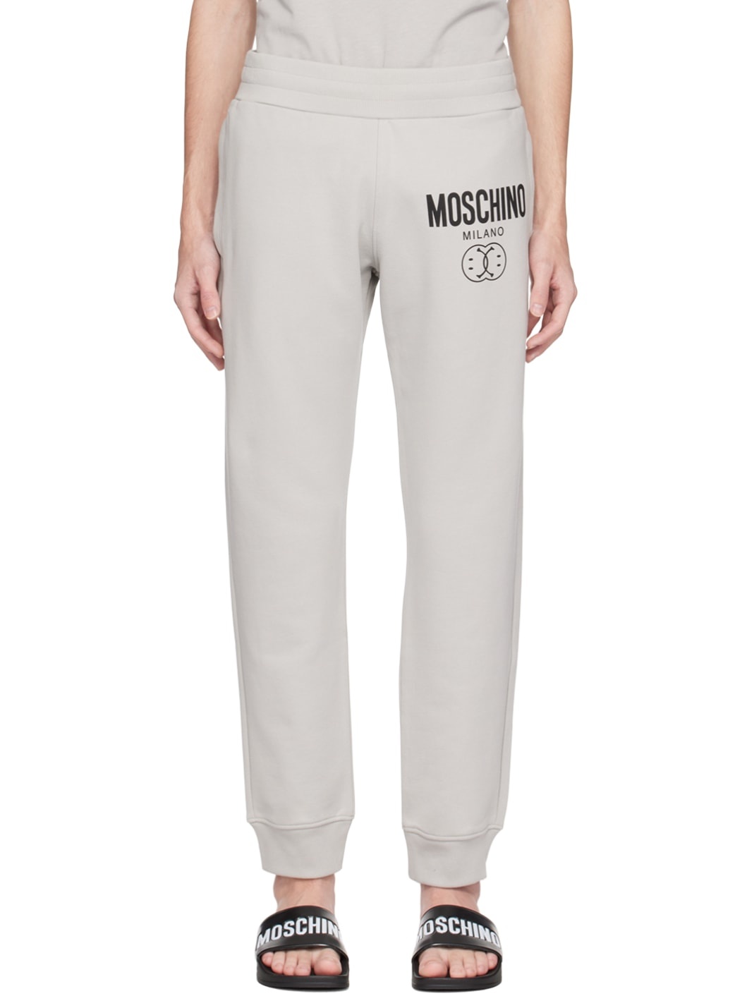 Organic cotton French terry lounge pants. · Concealed drawstring at elasticized waistband · Four-pocket styling · Mock-fly · Logo graphic printed at front · Zip vents at rib knit cuffs Part of the Moschino x Smiley® collection. Supplier color: Gray