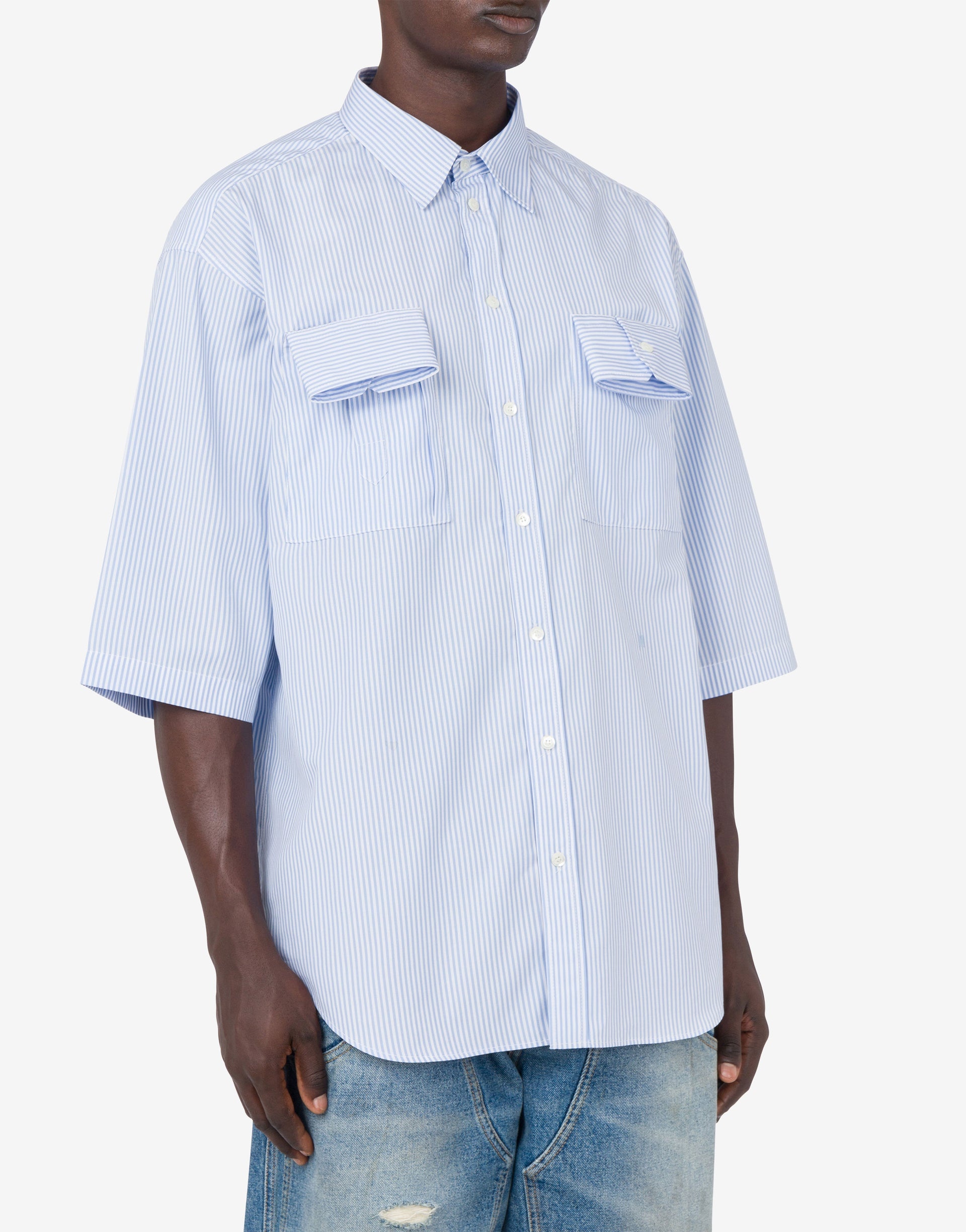 STRIPED COTTON POPLIN SHIRT WITH POCKETS INSPIRED BY CLASSIC SHIRT CUFFS. PRODUCT DETAILS RELAXED FIT - DECORATIVE CUFFS ON FRONT POCKETS - CLASSIC COLLAR - ELBOW-LENGTH SLEEVES - FRONT BUTTON CLOSURE FABRIC: 100% COTTON SKU: AEF251ZZA020302322303 FITTING & DIMENSIONS - MODEL HEIGHT: 185 CM - MODEL BUST: 103 CM - MODEL WAIST: 84 CM - MODEL HIPS: 104 CM - MODEL SIZE: 48