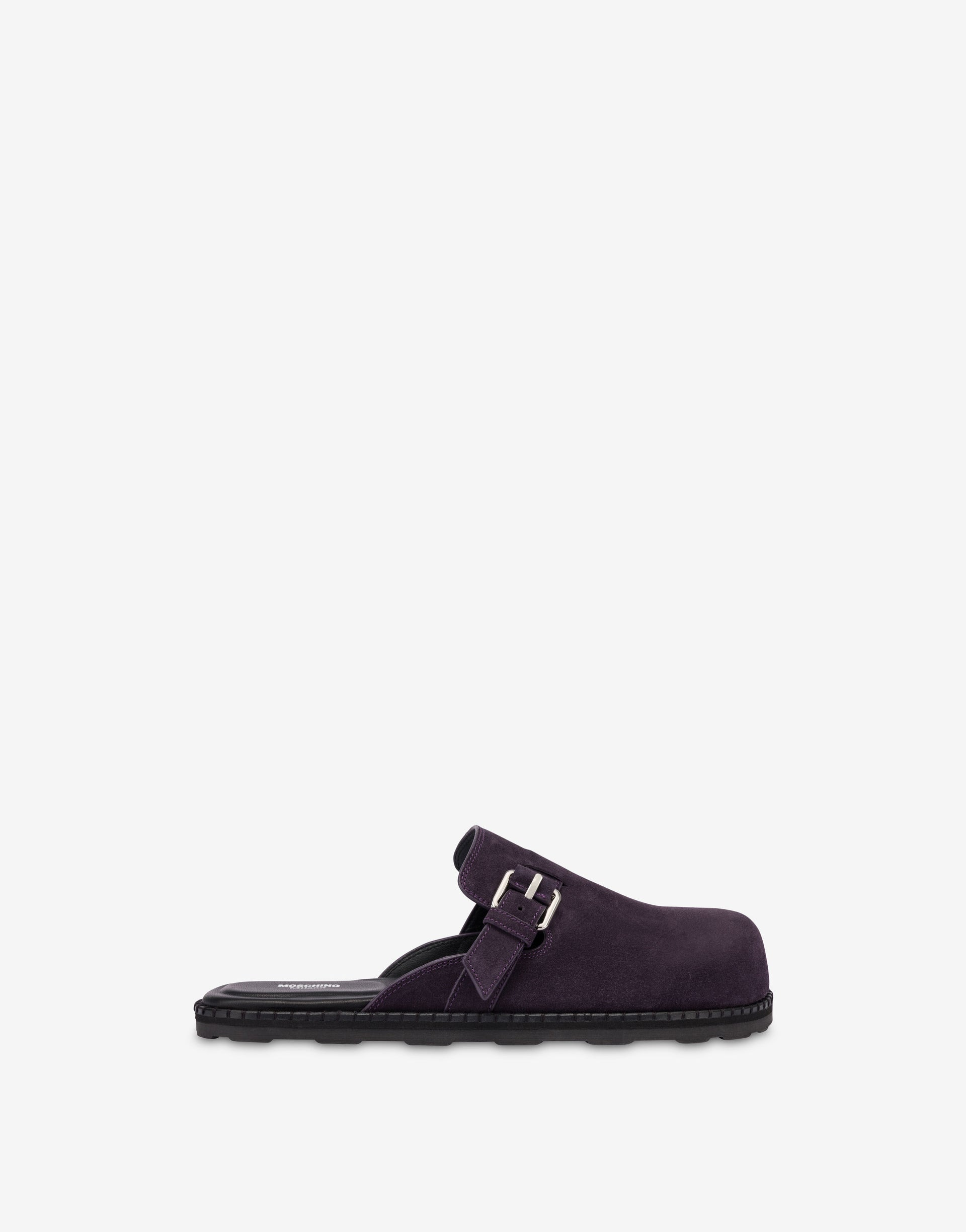 A SUEDE SABOT WITH AN ADJUSTABLE STRAP AND A VERY ACCENTUATED, ROUNDED TOE. THE PADDED INSOLE COVERED IN BLACK NAPPA LEATHER OFFERS EXCEPTIONAL COMFORT. STRAP WITH METAL BUCKLE RUBBER SOLE BOTTOM: 100% RUBBER LINING: 50% CALFSKIN, 50% SHEEPSKIN UPPER: 100% CALFSKIN CODE: POLMB10152G0MGF065A FIT HEEL HEIGHT: 2 CM