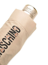 Supermind logo-print umbrella Supermind logo-print umbrella from MOSCHINO featuring beige, black, waterproof, six-panel construction, all-over logo print, removable cover and wrist strap. Imported Composition Polyester 100%