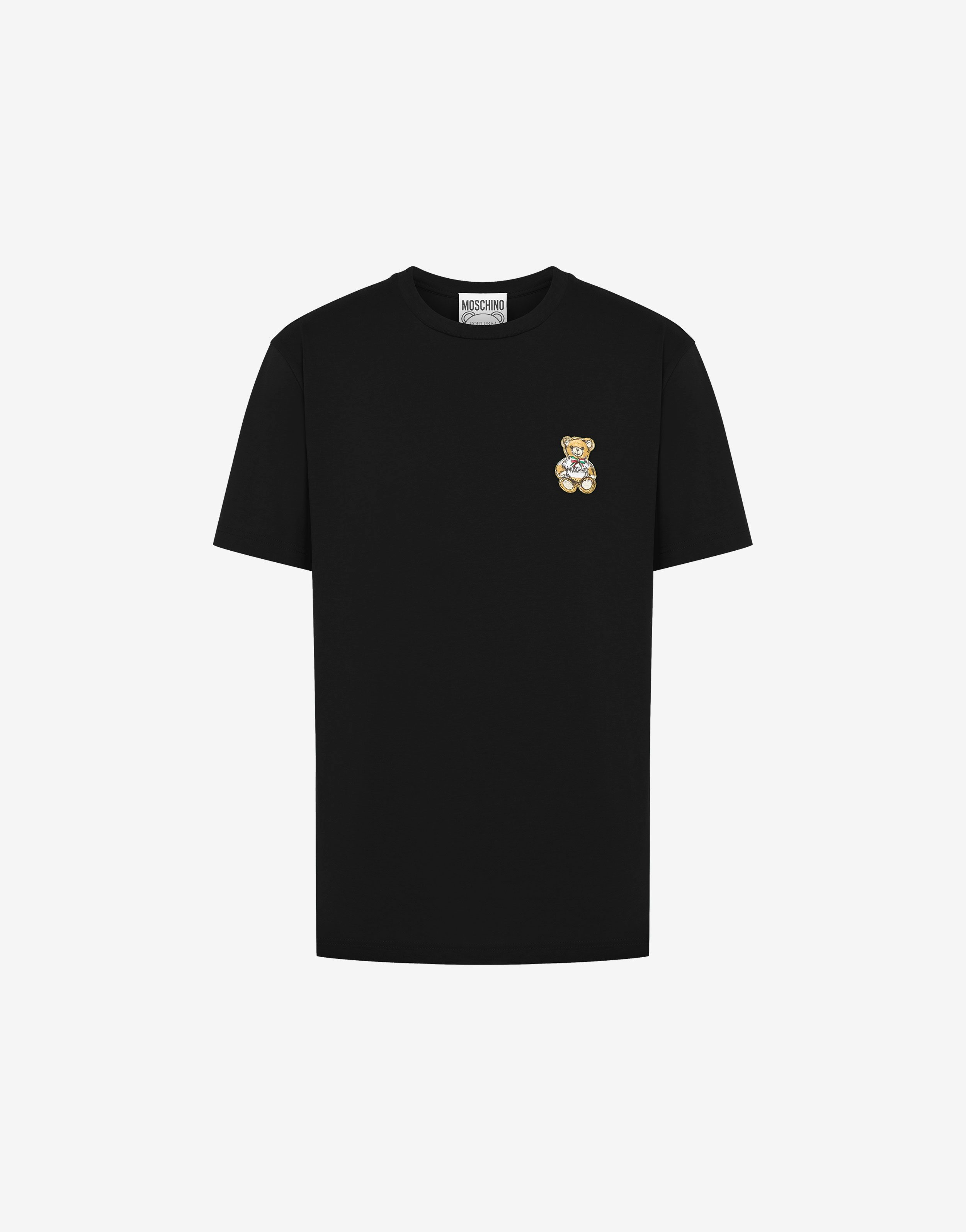 ORGANIC COTTON JERSEY T-SHIRT WITH MOSCHINO TEDDY BEAR PATCH ON THE FRONT. REGULAR FIT SHORT SLEEVES FABRIC: 100% COTTON CODE: AEF242ZR072370410555 FIT MODEL BUST SIZE: 103 CM MODEL HEIGHT: 185 CM MODEL HIPS: 104 CM MODEL SIZE: 48 CM MODEL WAIST: 84 CM