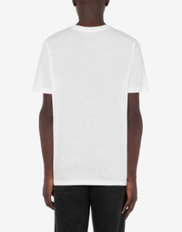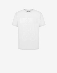 Organic cotton jersey T-shirt with logo print and tonal Moschino Teddy Bear. - Regular fit - Print on the front - Short sleeves Fabric:100% Cotton Code: AEF231ZR073020411001 FIT - Regular fit - Model bust size : 94 - Model height : 186 cm - Model Hips : 95 cm - Model size : 48 - Model waist : 75 cm