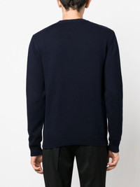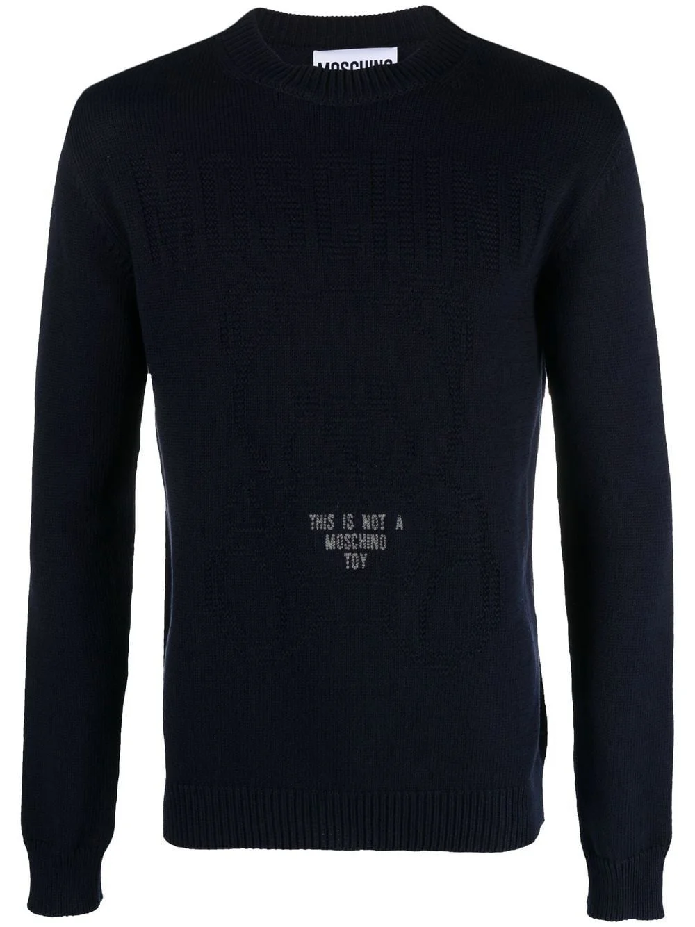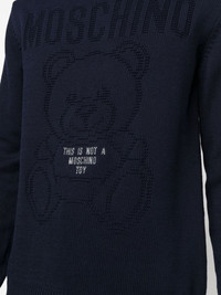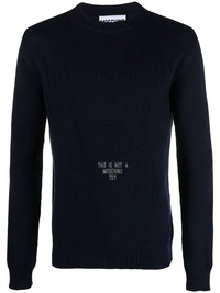 slogan-intarsia sweater Highlights - Navy blue - Cotton - Logo print to the front - Teddy bear print - Round neck - Long sleeves Imported Composition Cotton 100% SIZE & FIT Model measurements Height 6 ft 2 in(1.87 m) Bust/Chest 36.41 in(92.5 cm) Hips 35.43 in(90 cm) Waist 29.52 in(75 cm) FittingInformation This piece fits true to size. We recommend you get your regular size Cut for a relaxed fit Made with a mid-weight fabric Washing instructions Hand Wash