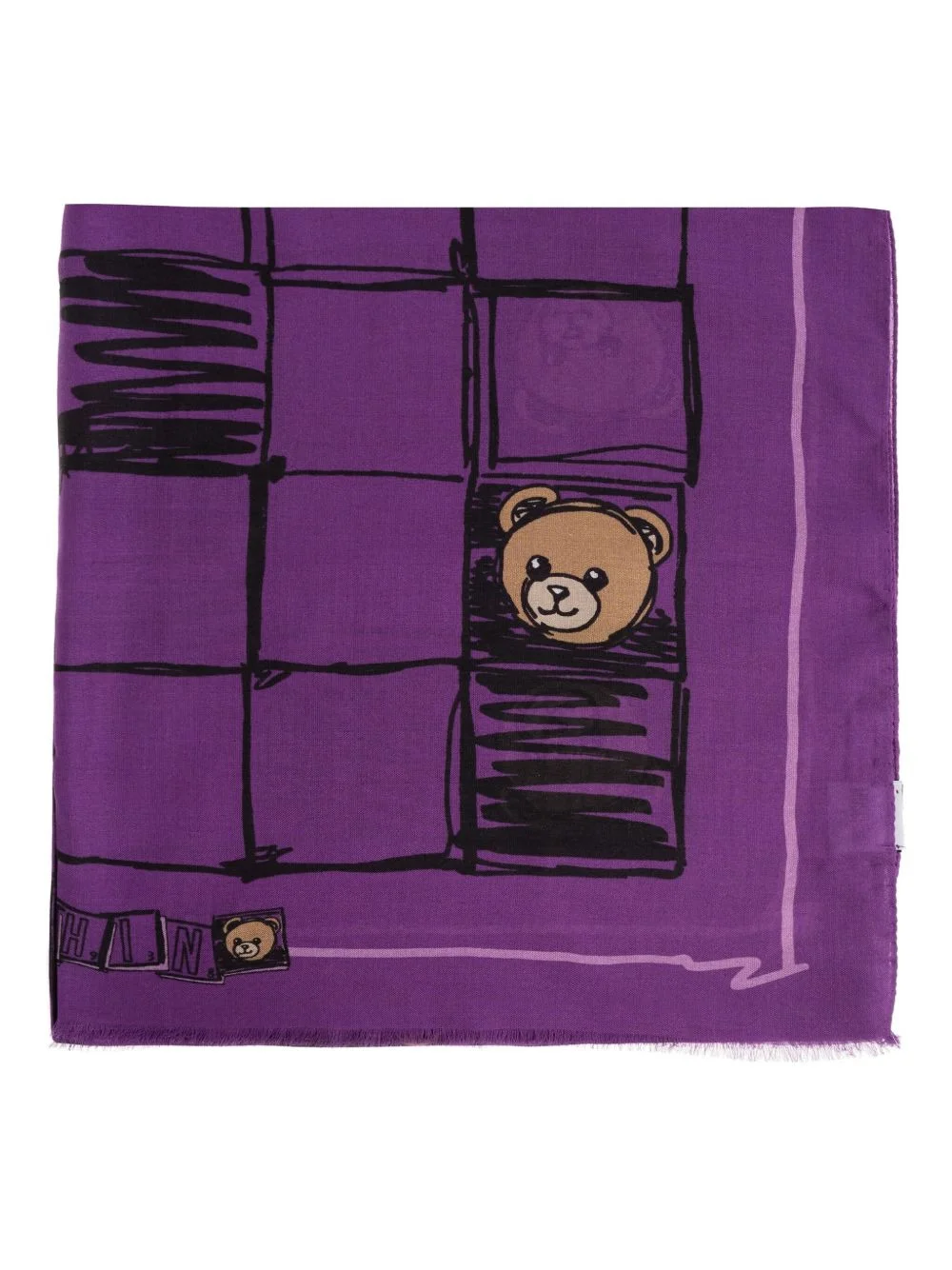 Teddy-print scarf Highlights - Purple - Teddy bear print - Sketched grid pattern - Frayed edges Made in Italy Composition Modal 93%, Cashmere 7% SIZE & FIT Measurement LENGTH 70.86 in(180 cm) WIDTH 27.55 in(70 cm) Washing instructions Read Manufacturer Guidelines