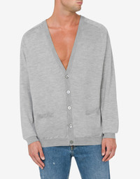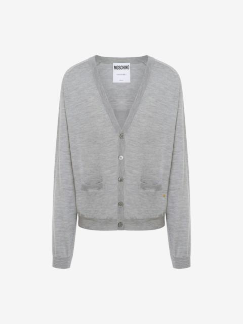 FINE WOOL AND SILK CARDIGAN WITH MINI MOSCHINO M IN GOLD GALVANIC. METAL LETTER M V-NECK TWO FRONT POCKETS FRONT BUTTON CLOSURE FABRIC: 70% PURE WOOL, 30% SILK CODE: AEF251ZZ090502010486