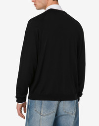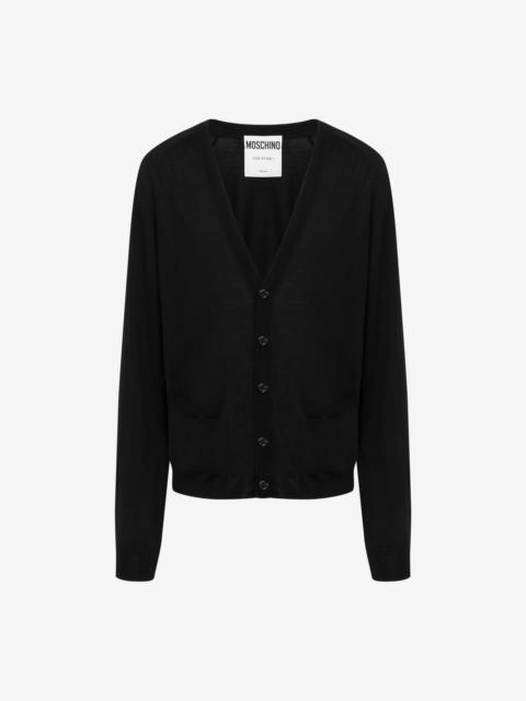 FINE WOOL AND SILK CARDIGAN WITH MINI MOSCHINO M IN GOLD GALVANIC. METAL LETTER M V-NECK TWO FRONT POCKETS FRONT BUTTON CLOSURE FABRIC: 70% PURE WOOL, 30% SILK CODE: AEF251ZZ090502010555 FIT MODEL BUST SIZE: 103 CM MODEL HEIGHT: 185 CM MODEL HIPS: 104 CM MODEL SIZE: 48 CM MODEL WAIST: 84 CM
