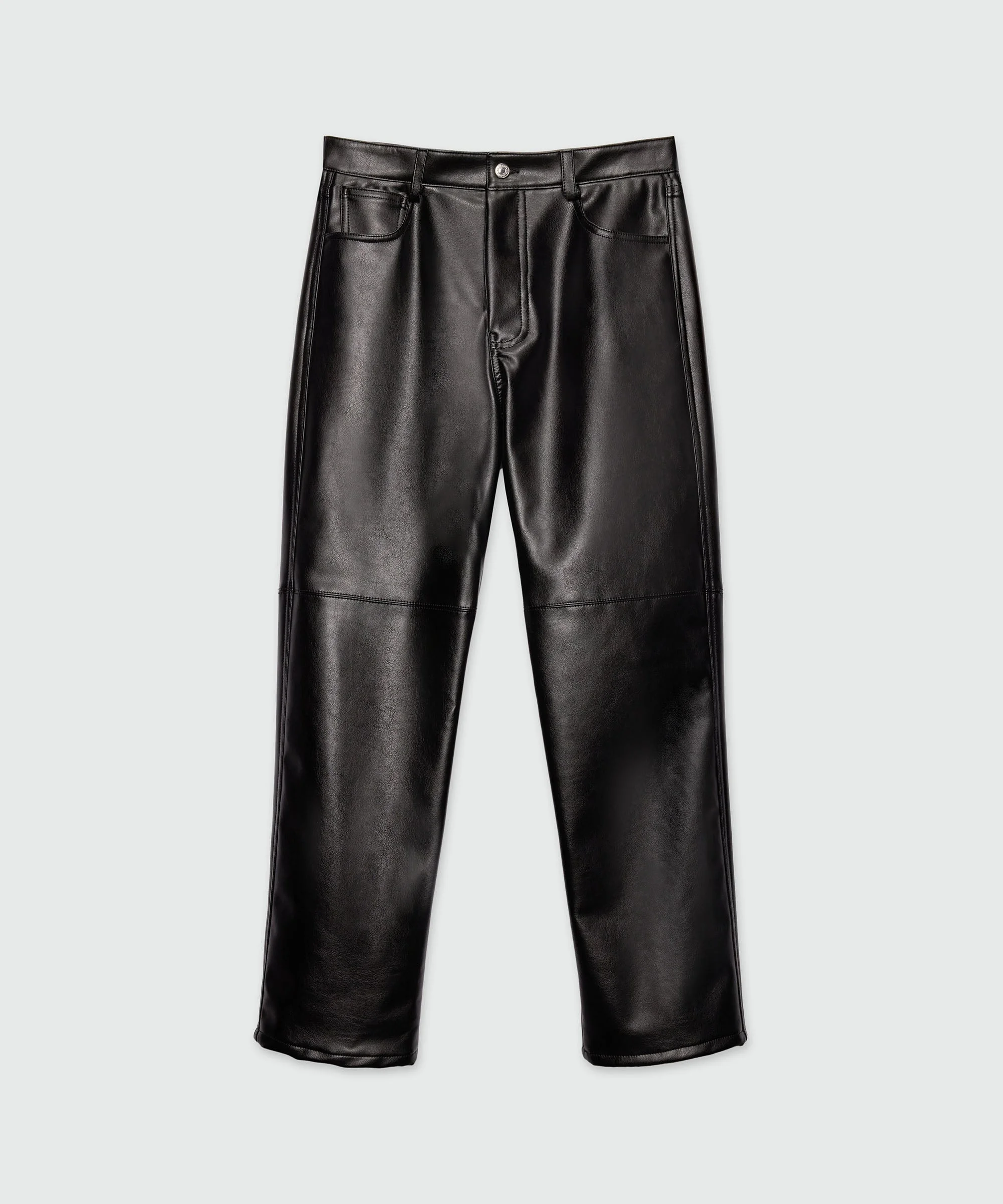 Structured faux leather trousers. Horizontal knee seams, five-pocket styling with belt loops. Concealed zip and metal button closure. MSGM logo patch on the back. Oversized fit. The model is wearing size M/48. CODE: 3940MP08-257509-99 Details and fit - 51% PL / 49% PU