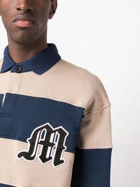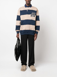 logo-patch striped polo sweatshirt Highlights - Beige/navy blue - Cotton - Horizontal stripe pattern - Logo patch at the chest - Polo collar - Short front button fastening - Long sleeves - Ribbed cuffs and hem Made in Italy Composition Cotton 100% SIZE & FIT Model measurements Height 6 ft 0 in(1.84 m) Bust/Chest 36.22 in(92 cm) Hips 35.43 in(90 cm) Waist 26.77 in(68 cm) FittingInformation Designed to be unstructured, offering a loose fit throughout Made from a midweight non-stretch fabric, this piece offers minimal elasticity when worn This piece fits true to size – take your usual size Washing instructions Hand Wash