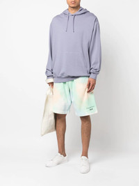 logo-print tie-dye shorts Highlights - Green/multicolour - Organic cotton - Tie-dye pattern - Logo print at the leg - Logo patch to the rear - Elasticated drawstring waistband - Two side welt pockets - Rear patch pocket - Knee-length Made in Italy Composition Organic Cotton 100% SIZE & FIT Model measurements Height 6 ft 2 in(1.89 m) Bust/Chest 36.22 in(92 cm) Hips 37.79 in(96 cm) Waist 29.52 in(75 cm) FittingInformation This piece fits true to size. We recommend you get your regular size Designed for a slim fit at the waist and loose over the leg Made with a mid-weight fabric Washing instructions Hand Wash