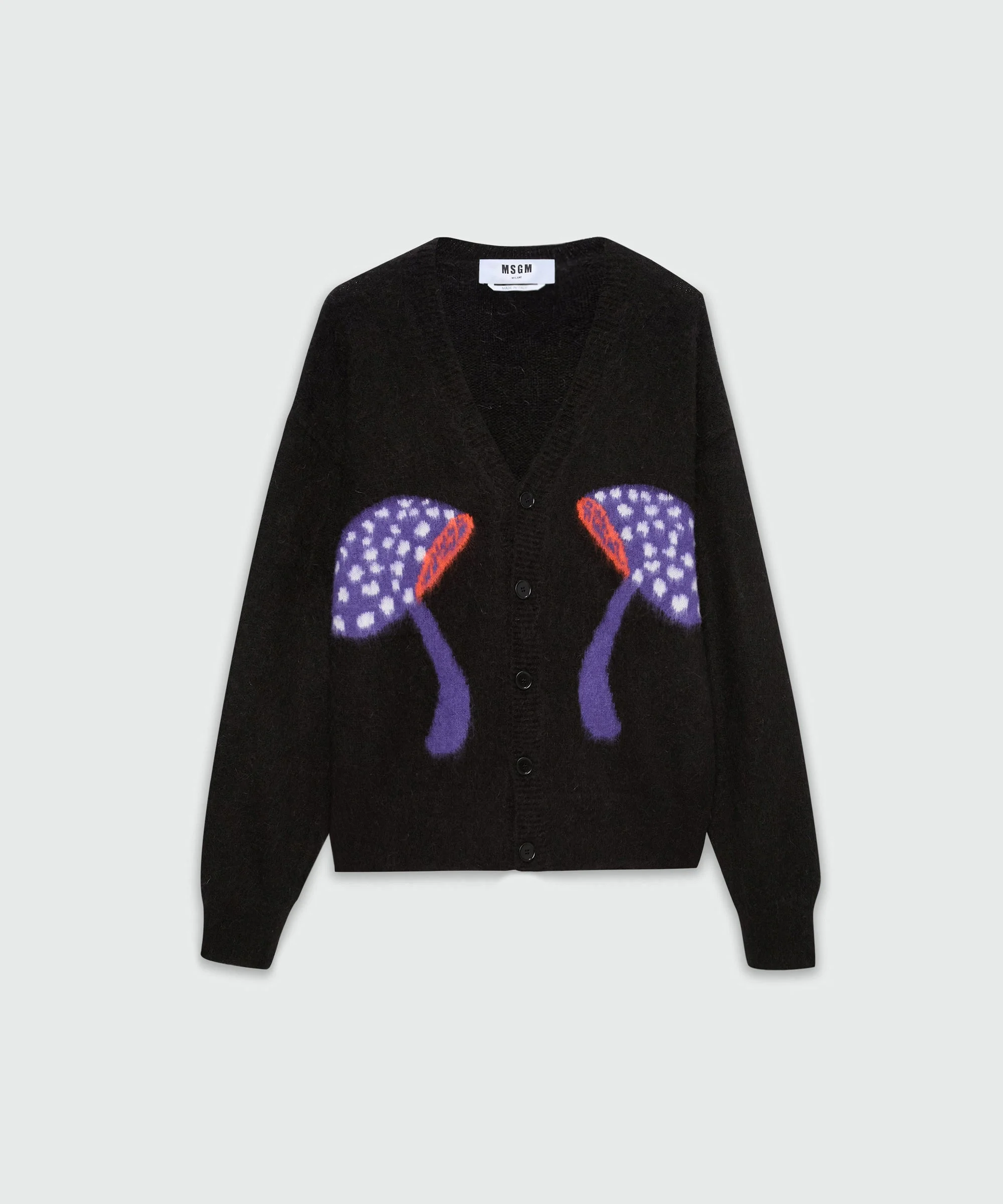 Black brushed mohair cardigan with "Fantastic Mushroom" jacquard pattern