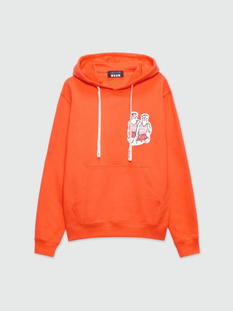Sailors in love, hinted at, desired, are told through the light gestures and dissolving watercolors of Luke Edward Hall, adding to the collection that touch of refinement and eccentricity, a hallmark of MSGM. Solid color cotton jersey sweatshirt with "Two sailors" embroidery on the front. Hood with drawstring and front kangaroo pocket. Ribbed cuffs and bottom. Regular fit. The model wears size M/48. CODE: 3840MM144-257000-17 Details and fit - 100% CO