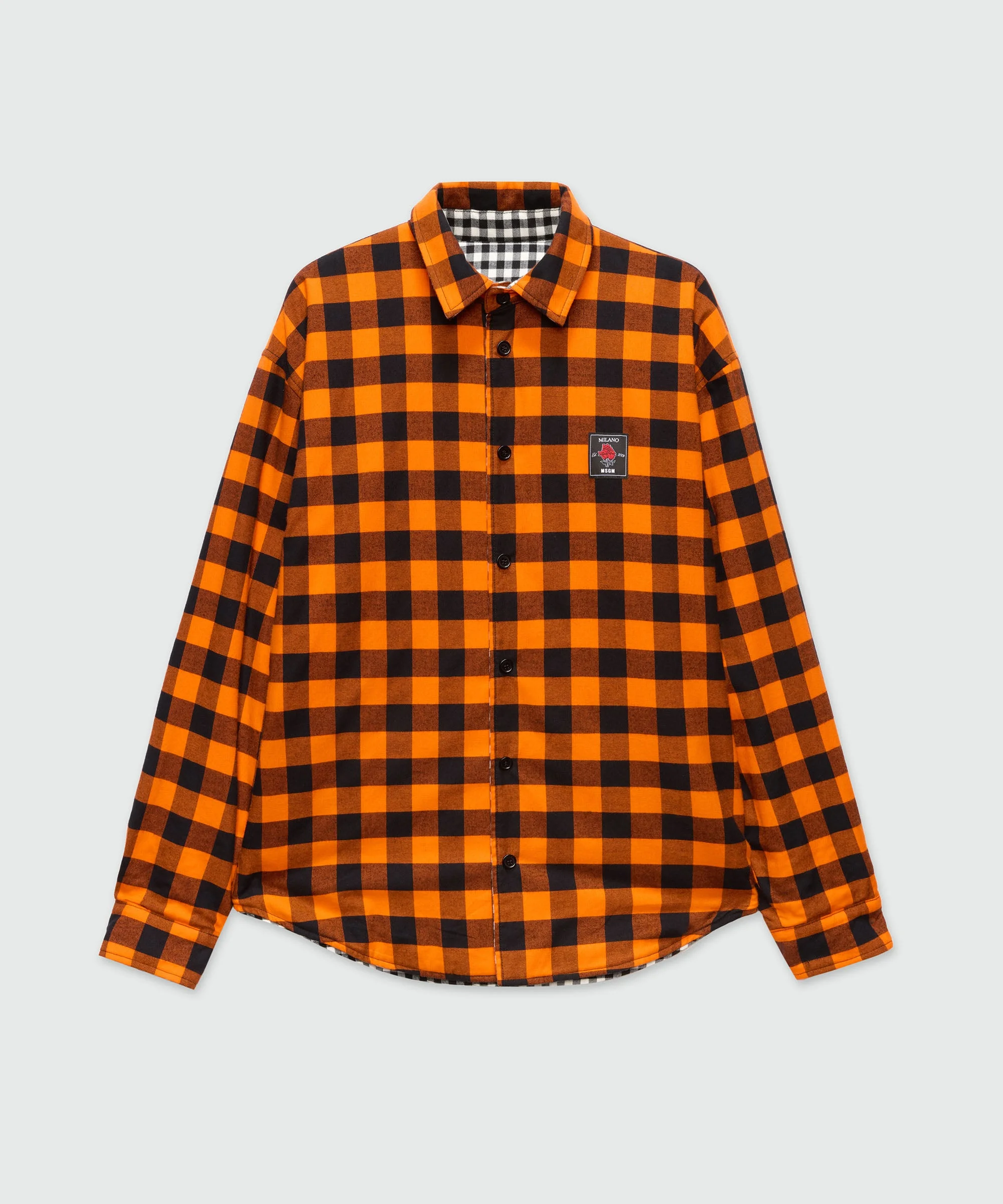 Double-sided cotton flannel shirt with a gingham pattern. One side features an orange and black pattern with an MSGM label sewn onto the chest; the other side is black and white with a 3D logo embroidery on the chest. Classic collar, front button closure, long sleeves with buttoned cuffs. Rounded hem. Regular fit. The model is wearing size M/48. CODE: 3940MH23-257502-01 Details and fit - 100% CO