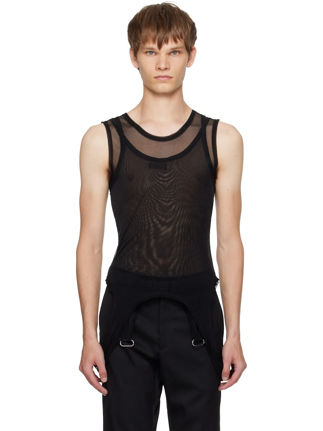 Sheer stretch nylon mesh tank top. · Layered construction · Crewneck · Garter straps at hem Supplier color: Black 82% polyamide, 18% elastane. Made in Tunisia 252345M214002