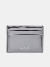 MUGLER wallet in gunmetal, faux leather construction, embossed signature spiral design, 3 card slots, embossed logo, lined. Made in Italy Outer: 66% Polyurethane 34% Polyester Inner: 100% Cotton One Size
