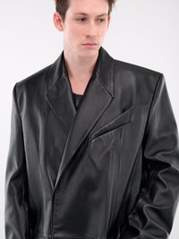MUGLER coat in black, paneled lamb leather construction, lapels, structured shoulders, long sleeves, front double-breasted closure, chest welt pocket, side flap pockets, back vent, straight hem, lined, relaxed fit. Made in France Outer: 100% Lamb Leather Inner: 100% Cupro European Sizing Model is 6’0” wearing size 50. Shoulders: 19" Chest: 38” Waist: 30”