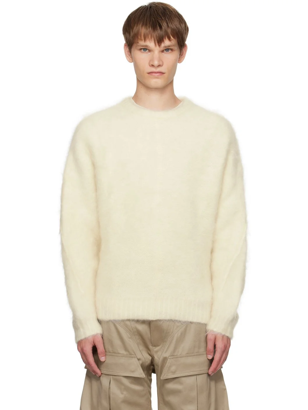Brushed knit stretch mohair- and wool-blend sweater. · Rib-knit crewneck, hem, and cuffs · Logo plaque at back collar Supplier color: White 50% mohair, 32% wool, 16% polyamide, 2% elastane. Made in Romania 252345M201000