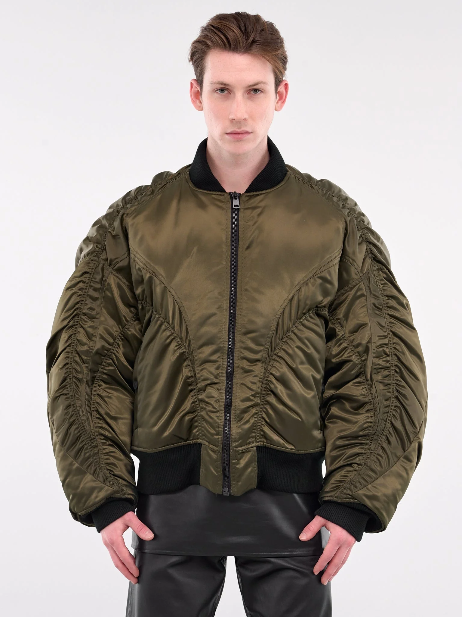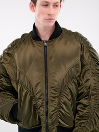 MUGLER jacket in green, paneled nylon construction, satin weave, ruching throughout, ribbed stand collar, front exposed zip closure, long sleeves, rib-knit cuffs & hem, curved hem, lined, oversized fit. Made in Ukraine Outer: 100% Nylon Inner: 100% Cupro Standard Sizing Model is 6’0” wearing size L. Shoulders: 19" Chest: 38” Waist: 30”