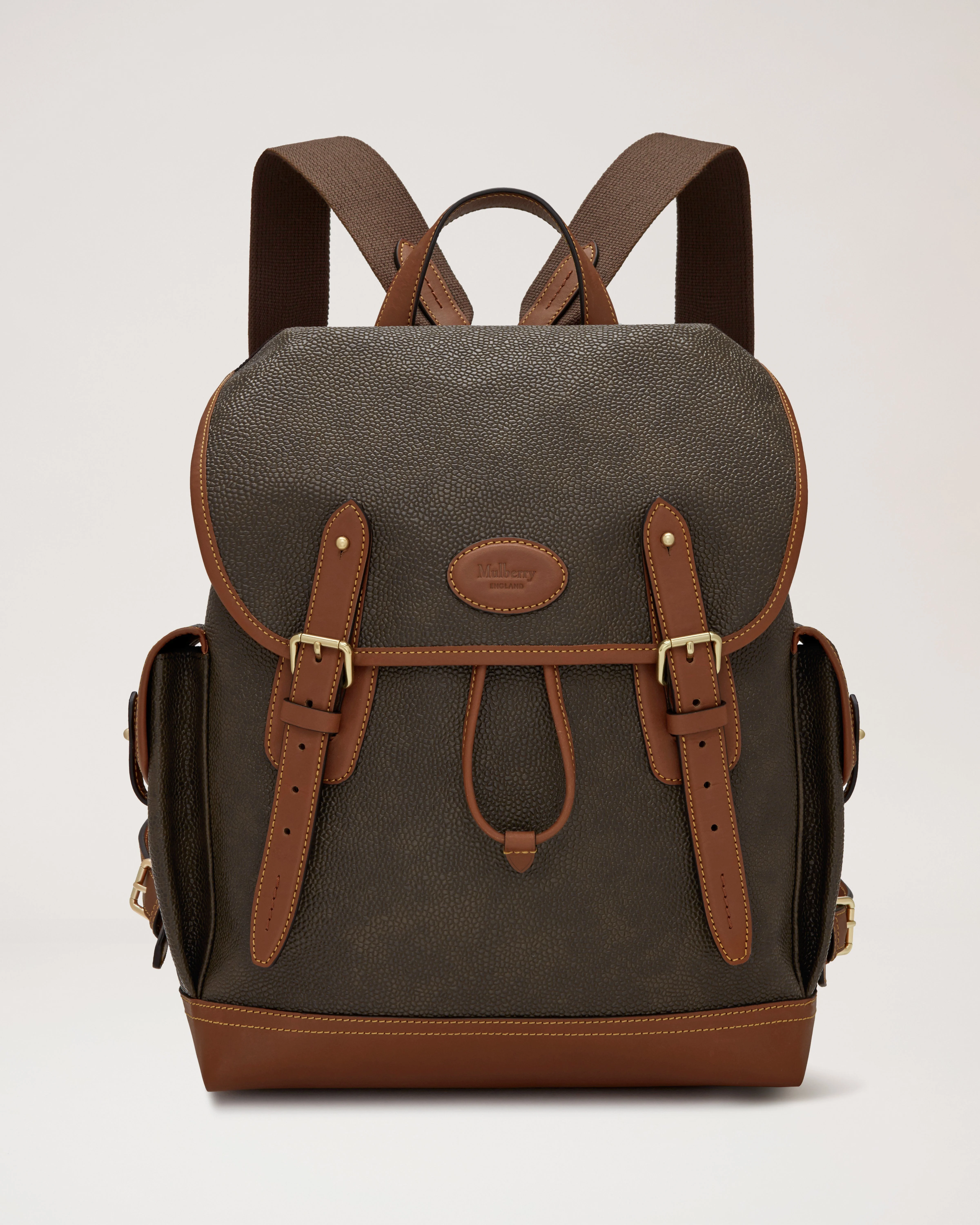 The Heritage collection was designed in tribute to the early bags of Mulberry, which were inspired by English country pursuits. The Heritage Backpack features practical pockets, belt and buckle strap detailing and a signature logo plaque. The straps can be adjusted to a personal fit and all your belongings are secured under the front flap. Details This bag features practical pockets, belt and buckle strap detailing. - One internal zipped pocket - Foil embossed Mulberry signature - Adjustable shoulder straps in webbing - Two Sam Browne studs for quick opening of the flap, with functional buckles - One main compartment with a drawstring closure under the flap - Two external side pockets with a flap, and secured by a Sam Browne stud - Canvas lining Height 15" Width 11½" Depth 5½" Weight ½kg, approximately Material BioVeg Scotchgrain This product features a heritage Mulberry material, Scotchgrain, which is durable, lightweight, made from recombined bio-based and recycled materials, and embossed with a distinctive pebble grain finish. The product is trimmed with a calf leather that has a very fine grain and a soft silky touch. This product's code is HS5094-127Q330