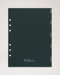 The classic, elegant stationery collection is made from the highest quality paper stock, designed and produced in England. These dividers are understated and slim, to help organise your stationery and contacts. This paper insert fits our Pocket Book size Mulberry organiser. Details This paper insert fits our Planner size Mulberry organiser. - Five dividers - Alphabetically labelled - All our stationery items are FSC® certified Height 8¼" Width 5¾" Material Paper The Mulberry approach is to make a positive difference to its people, environment and communities we work in. All our paper is sourced from responsible sources. This product's code is NZ7335-000Q633