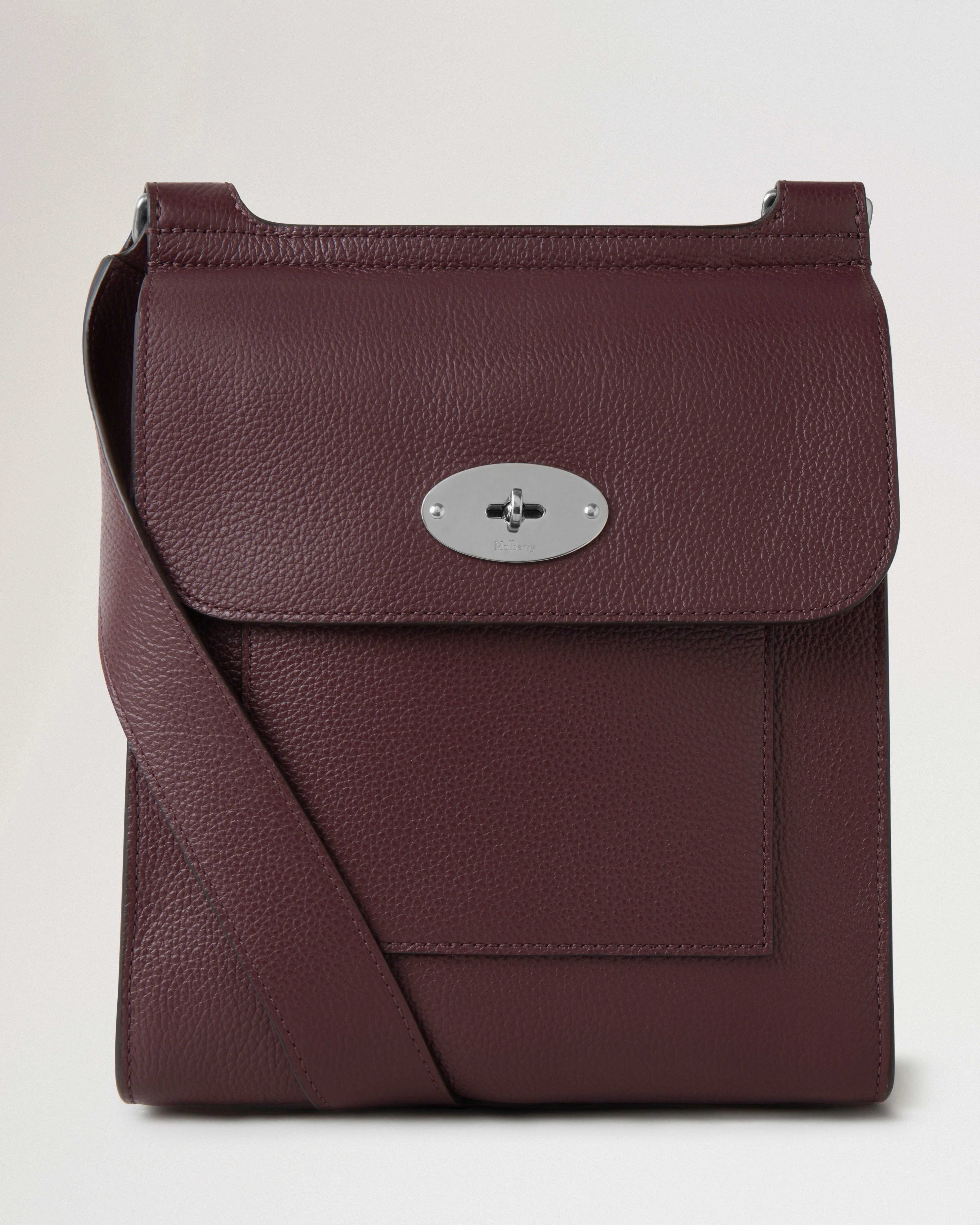 The classic Antony messenger bag has long been a unisex Mulberry favourite. The Small Antony is a more compact version of the practical hands-free style with an adjustable strap that can be worn across the body or over the shoulder. Details This smaller style messenger bag can be worn over the shoulder or across the body. - Postman's Lock closure - Silver Hardware Finish - One main compartment - Internal foil embossed Mulberry signature - Adjustable leather shoulder strap - One external slip pocket - Suede and Herringbone Lining Height 8" Width 7" Depth 2½" Shoulder Strap Drop 26" Weight ¼kg, approximately Material Small Classic Grain A soft cow leather with a small printed grain effect. The leather is lightly finished to protect the grain surface. This product's code is HH9365-205K560