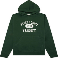 Museum of Peace and Quiet embraces minimalist design with the Varsity Hoodie. Crafted from 100% cotton, this hoodie offers a relaxed fit and ensures comfort and durability. It features a classic hood, kangaroo pocket, and ribbed trims, making it a versatile addition any wardrobe. Screen-printed graphics across the front complete the look. MOPQ SS25 55 FORE - 100% Cotton - Soft lining - Classic hood - Kangaroo pocket - Ribbed cuffs - Ribbed hem - Screen-printed graphics - Style No: MOPQ-SS25-55-FOR