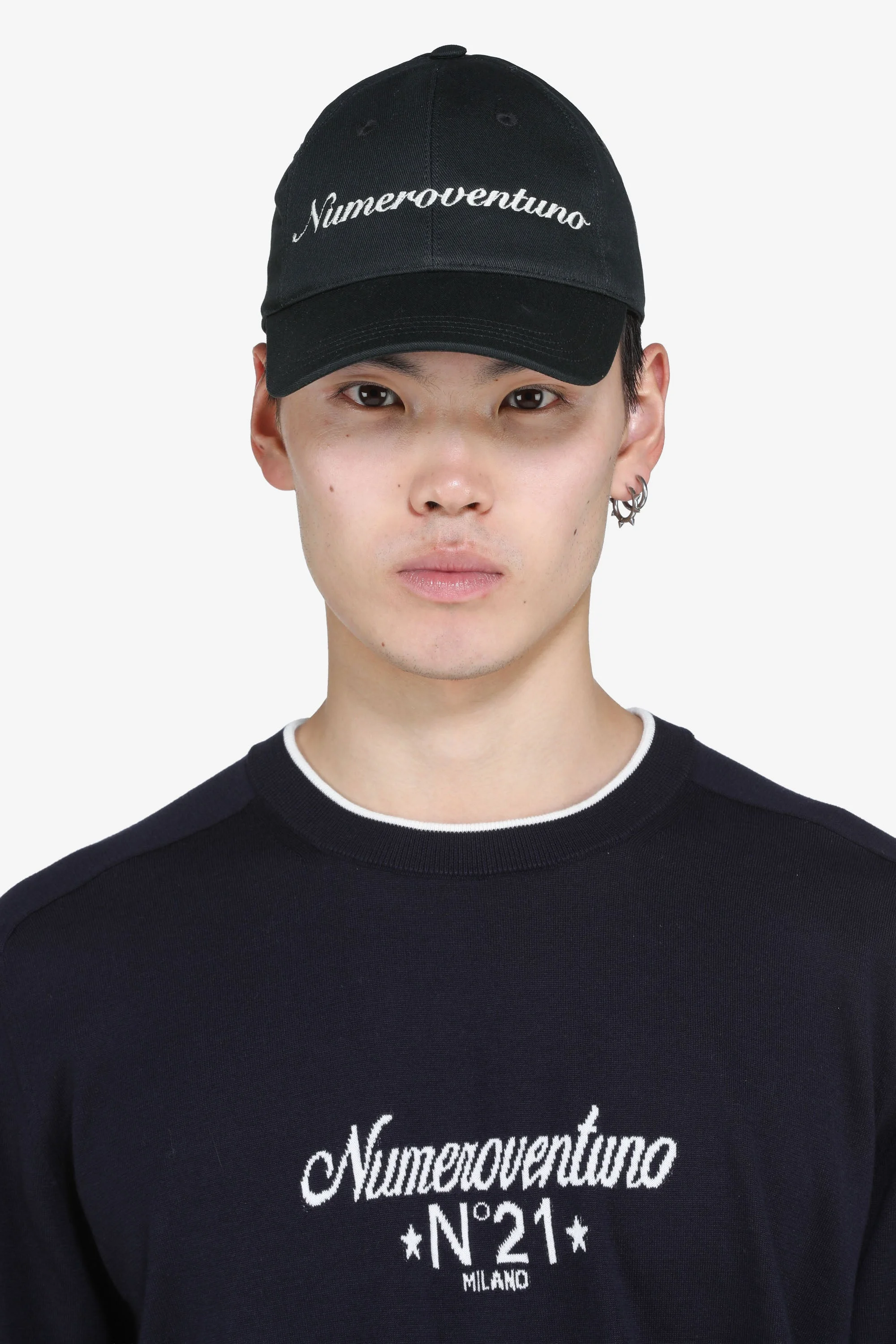 Six-panel baseball cap with a curved brim, black. The front features white embroidery contrasting with the white "Numeroventuno" lettering. The paneled construction is finished with visible stitching. DETAILS Color: Black Composition: 100%CO Product Code: 26EN1M1711169219000 Made in Italy SIZE AND VESTIBILITY One size fits all.