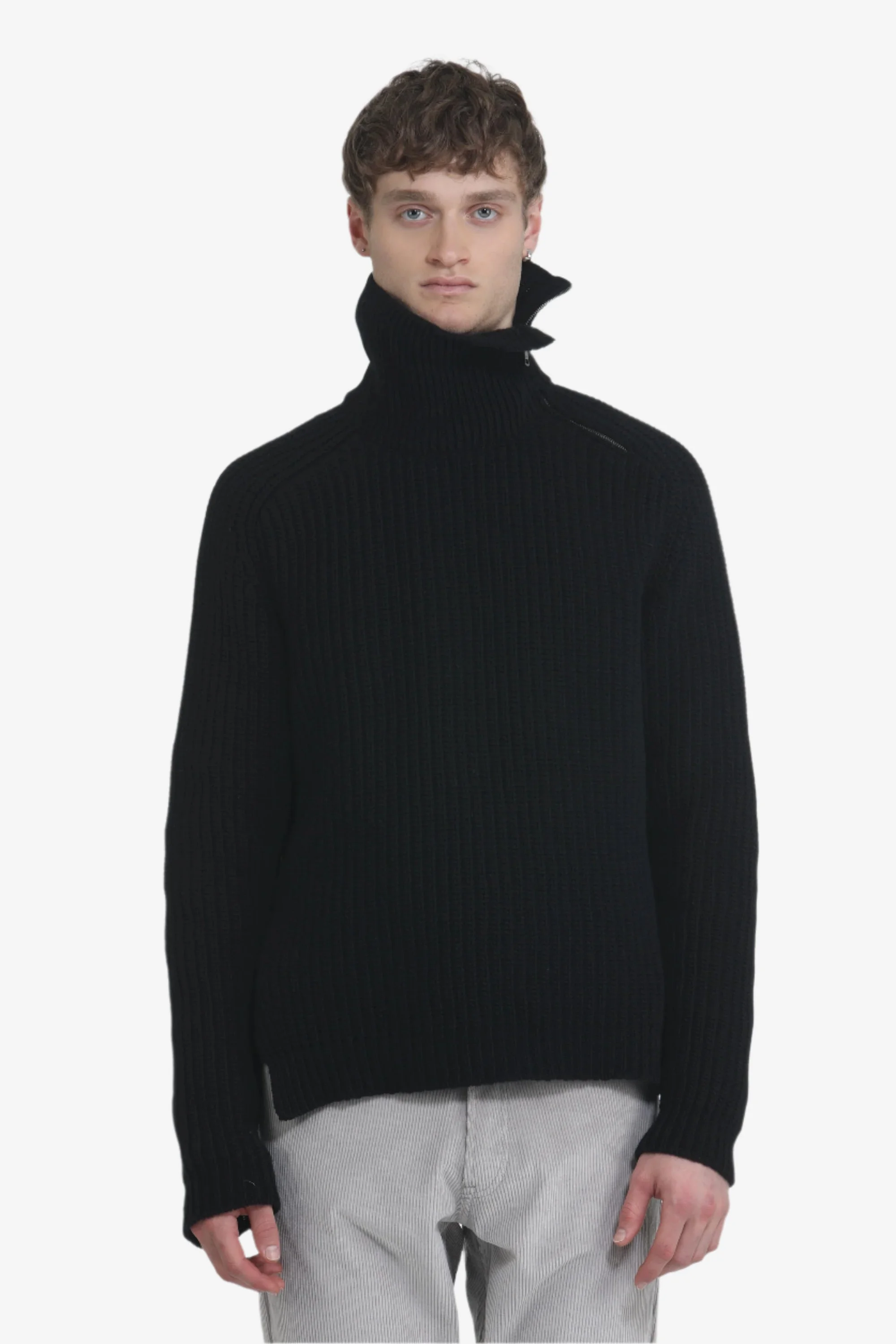 High-neck zip-up sweater in black ribbed knit. The garment features a regular fit with long sleeves and a straight hem. The asymmetrical zip closure at the neck adds a functional detail. The fabric has a thick, structured feel, perfect for colder weather. DETAILS Color: Black Composition: 100%WV Product Code: 25IN1M0A00470779000 Made in Italy SIZE AND VESTIBILITY The model wears size 48. The garment fits regular.
