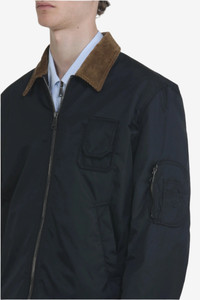Contrast collar jacket made from black technical fabric with a zip front fastening. It features a brown corduroy collar that creates a contrasting effect. The fit is regular and the construction includes front pockets and a zipped arm pocket. DETAILS Color: Black Composition: 100%PA Product Code: 25IN1M0O02252469000 Made In Italy SIZE AND VESTIBILITY The model wears size M. The garment fits regular.