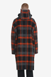 Long checked coat with hood made of thick fabric with a checkered pattern in shades of red, black, and gray. It has a loose, straight fit, exposed seams, and a front snap closure. It features a full hood and two side pockets in the seam. DETAILS Color: Black Background Orange Picture Composition: 70%PL 30%WO Product Code: 25IN1M0N0113065Q9B1 Made in Italy SIZE AND VESTIBILITY The model wears size M. The garment fits regular.