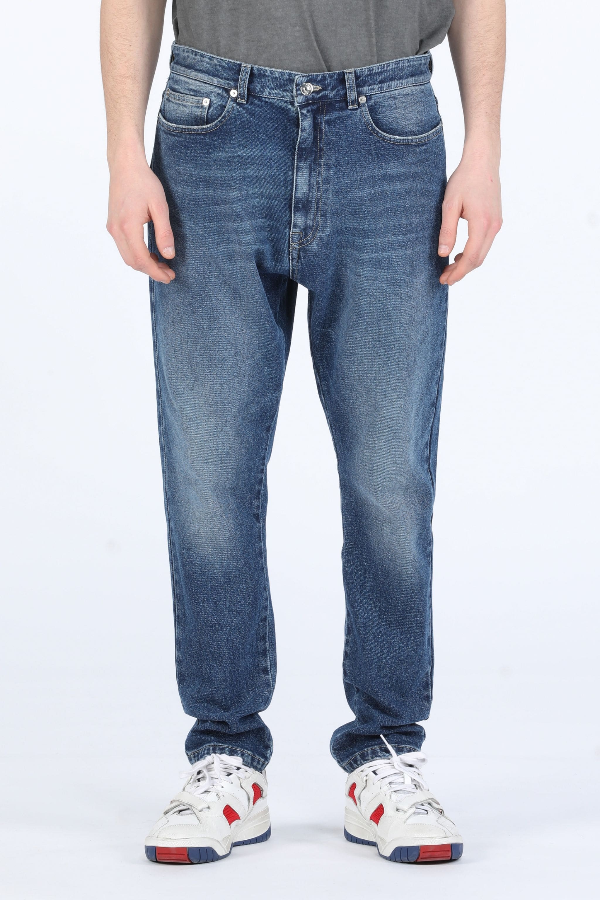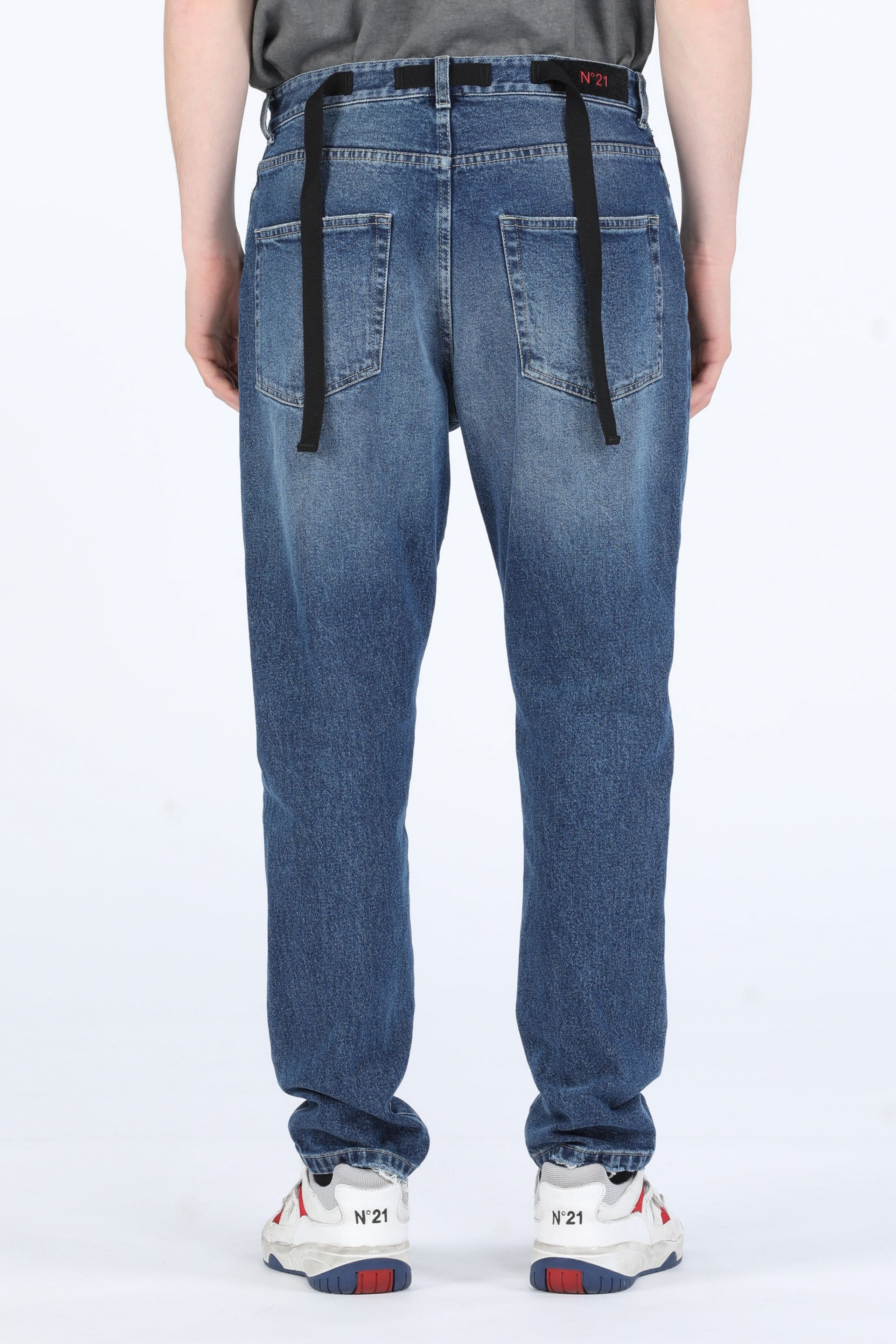 FADED BLUE COTTON JEANS WITH EXTENDED GROSGRAIN TIES AND VELCRO® N21 LOGO PATCH AT THE BACK. MID-RISE WAIST WITH BELT LOOPS. 5-POCKET DESIGN. BUTTON AND ZIP FRONT FASTENING MORE DETAILS SLIM FIT 98% COTTON, 2% ELASTANE MACHINE WASH AT 30°C MADE IN ITALY STYLE ID: 22IN1M0220200516001 SIZE AND FIT MODEL IS 188CM AND WEARS IT SIZE 48
