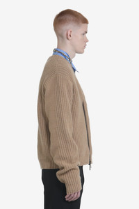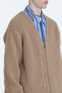V-neck sweater with buttons and zip closure made of a beige chunky knit fabric. It features a double front zip and button closure, long sleeves with ribbed cuffs, and a relaxed fit. The construction combines ribbed details with smooth knit sections, offering a functional and clean design. DETAILS Color: Biscuit Composition: 100%WV Product Code: 25IN1M0A00570771209 Made in Italy SIZE AND VESTIBILITY The model wears size 48. The garment fits regular.