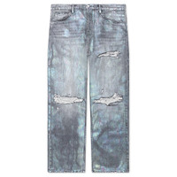 Nahmias introduces the Oil Spill Baggy Jean to its repertoire. This garment offers a comfortable fit with its baggy silhouette and cotton construction. The jeans are highlighted by the unique oil spill wash treatment, completed with a zip fly closure, belt loops, and a five-pocket design. - 100% Cotton - five-pocket design - Oil spill wash technique - Distressed - Baggy fit - Style No: D6-P43-065