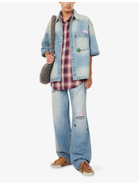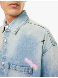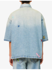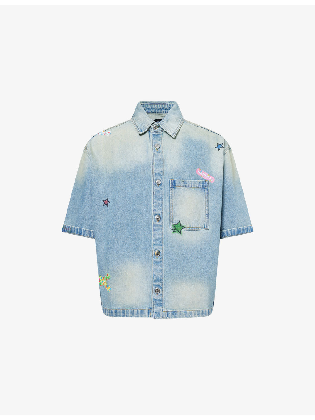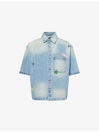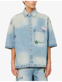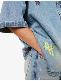 PRODUCT DETAILS - Nahmias denim shirt - 100% cotton - Exposed button fastening at front - Collar, dropped shoulder, short sleeves, one patch pocket at front, all-over printed detail, distressed detailing, faded wash - Dry clean - Made in USA - Size medium: length 29.5in / 75cm, chest 51.9in / 132cm - Model is 6ft 2in/1.88m and wears a size medium - Lightweight, non-stretch Ref: R04476911