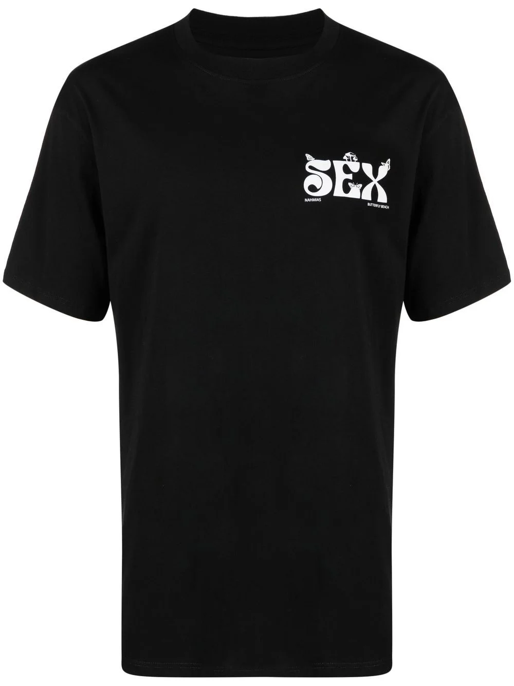 slogan-print T-shirt Nahmias' T-shirt is punctuated by a slogan at the chest and rear in contrasting white hues that creates a striking effect. The bold letters are detailed with mushroom and butterfly motifs - a nod to mother nature. Made in United States Composition Cotton 100% SIZE & FIT Model measurements Height 6 ft 2 in(1.87 m) Bust/Chest 36.22 in(92 cm) Hips 37 in(94 cm) Waist 27.95 in(71 cm) FittingInformation This piece fits true to size. We recommend you get your regular size Cut for a relaxed fit Made with a mid-weight fabric